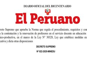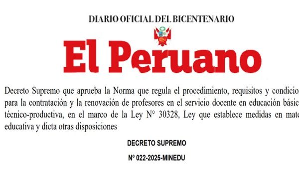 Según el DECRETO SUPREMO N° 022-2025-MINEDU, publicado en el diario El Peruano, aprueba la Norma que regula el procedimiento requisitos y condiciones para la contratación y la renovación de profesores en el servicio docente en educación básica y técnico-productiva en el marco de la Ley N° 30328 Ley que establece medidas en materia educativa y…