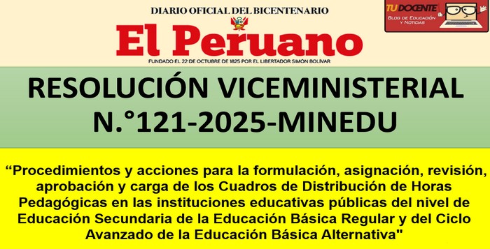 Mediante la RVM N° 121 -2025- MINEDU se aprobó la norma técnica denominada “Procedimientos y acciones para la formulación, asignación, revisión, aprobación y carga de los Cuadros de Distribución de Horas Pedagógicas en las instituciones educativas públicas del nivel de Educación Secundaria de la Educación Básica Regular y del Ciclo Avanzado de la Educación Básica Alternativa”, y dictan otras disposiciones